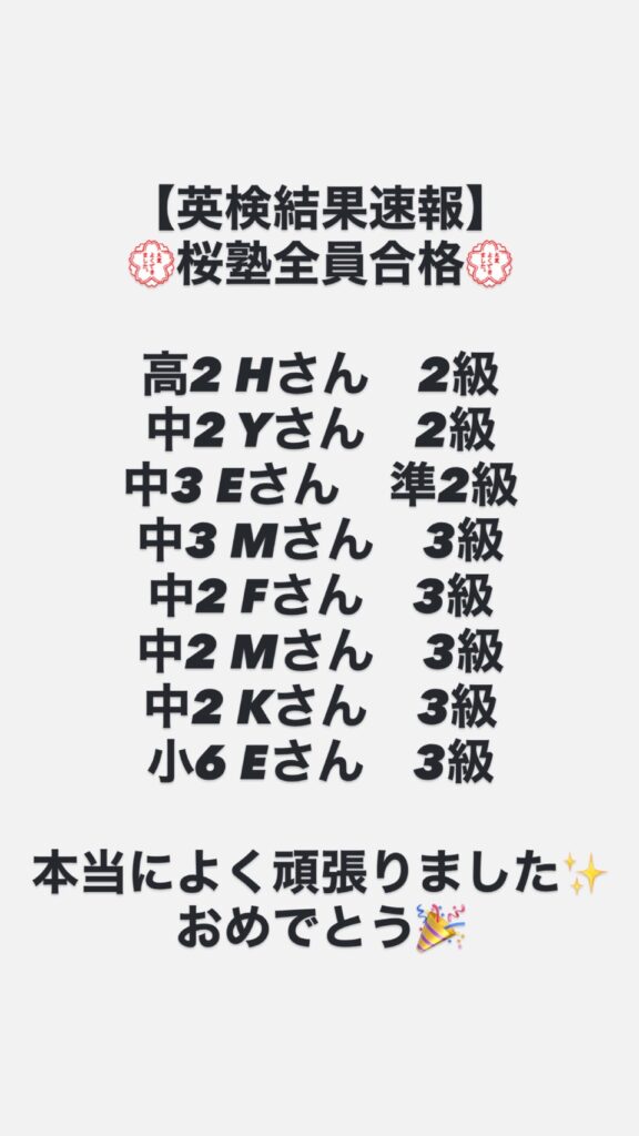 【速報】桜塾英検結果 2025年11月25日 【英検結果速報✨】桜塾全員合格しました!🎉 みんな本当におめでとう👏コツコツ続けてきた努力がしっかり実りました! 次の級に挑戦する子も、学校の成績を伸ばしたい子も、一緒に頑張ろう✨ ⸻ 🌸塾生募集中! ✔ 英検対策したい!✔ 定期テストで点数を上げたい!✔ 少人数でしっかり見てほしい!✔ 勉強のやり方から教えてほしい! そんな方はぜひ桜塾へ☺️体験授業・見学も受付中!